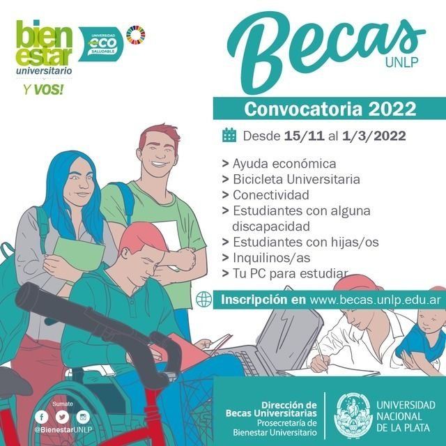 Becas para estudiantes inquilinas/os: beneficio económico destinado a quienes no sean oriundos de La Plata o la región, y deban alquilar un inmueble o pensión, para el desarrollo de sus estudios de grado