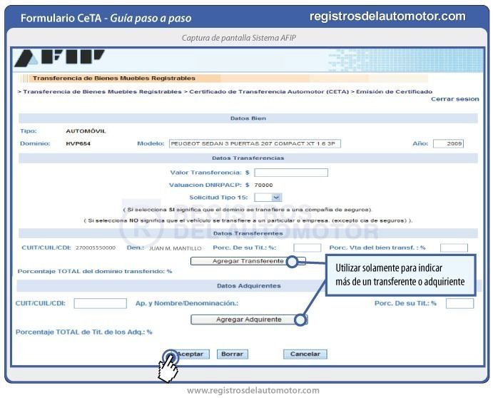 Aquellas personas que cuenten con el identificador solo deberán acceder al portal de AFIP, ingresar al servicio "Transferencia de Bienes Muebles Registrables" y luego elegir la opción CETA. Acto seguido, deberán ingresar a la opción "Emisión de Certificado" y completar la información solicitada: tipo de automotor y dominio (patente), valor de la transferencia, datos del transferente (vendedor) y datos personales del adquirente (comprado). Una vez completados ese trámite, las personas podrán ver en pantalla el código asignado para el "Certificado de Transferencia Automotor".