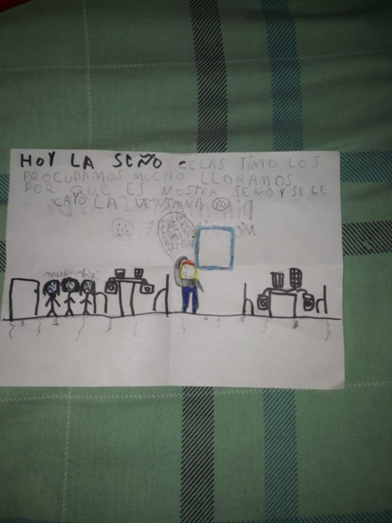 "Hoy la seño se lastimó, nos preocupamos mucho, lloramos, porque es nuestra seño y se le cayó la ventana", puede leerse en el texto que acompaña el dibujo hecho por los pequeños.