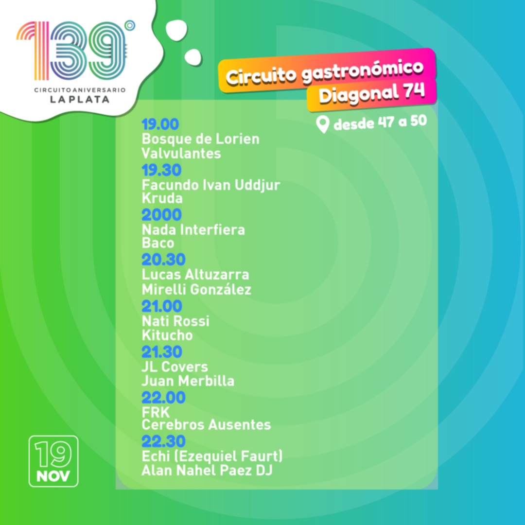 De similar modo, el cruce de diagonal 74 y 11 será el espacio elegido por el Municipio para el despliegue de las bandas locales Valvulantes (19), Kruda (19.30), Baco (20), Mirelli González (20.30), Kitucho (21), Juan Merbilla (21.30), Cerebros Ausentes (22) y el DJ Alan Nahel Páez (22.30).