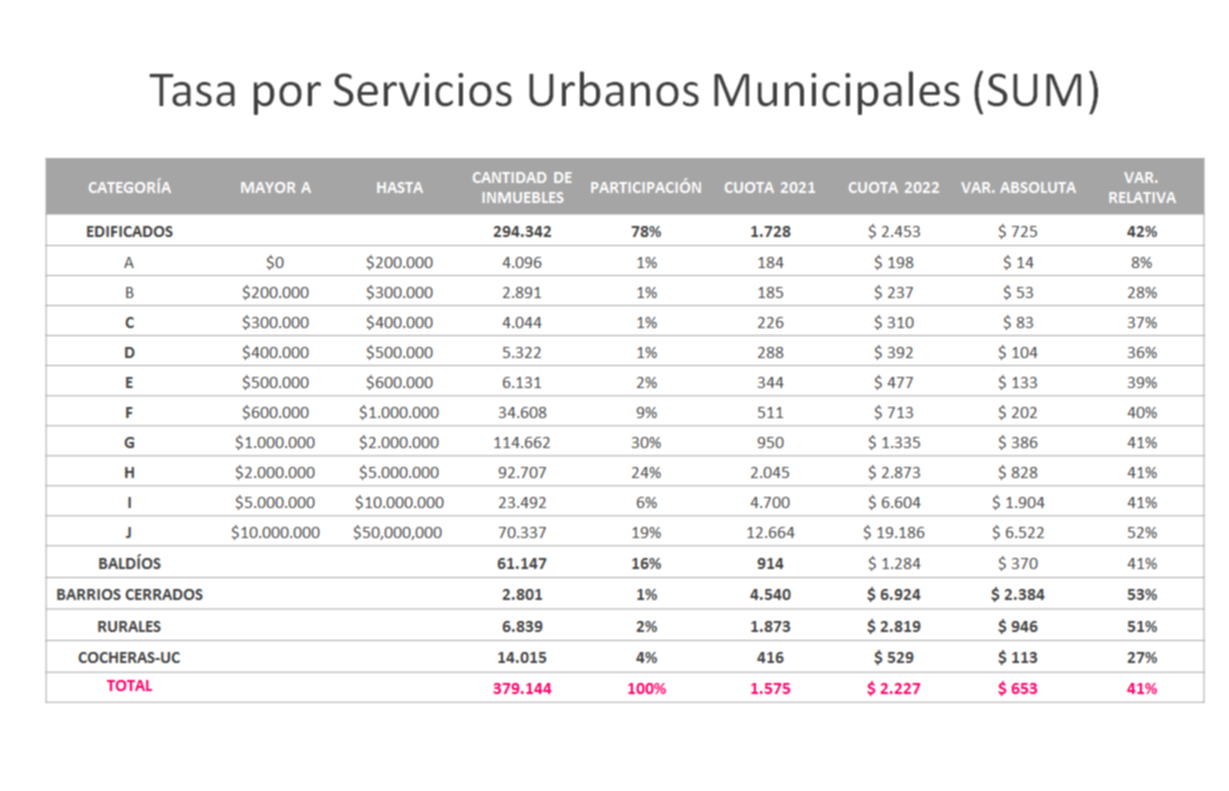 De acuerdo a la estructura de la Tasa SUM, el grueso de la propiedades están incluidas en las categorías G y H, valuadas entre un millón y 5 millones de pesos. Concentran el 54% de las propiedades: hay 114.662 propiedades de la categoría G (valuadas entre 1 y 2 millones de pesos) y 92.707 de la categoría H (valuadas entre 2 y 5 millones de pesos.