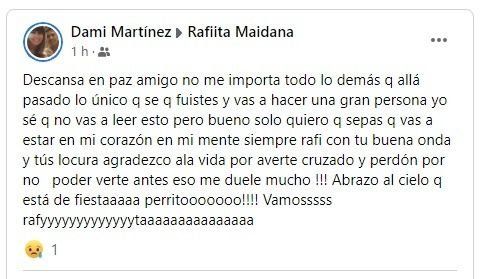 “Se te va a extrañar loquito”, “el cielo está de fiesta” y “mi corazón me dice que no pudiste ser vos, que pague quien tenga que pagar”, son algunos de los mensajes que redactaron sus amigos y allegados.