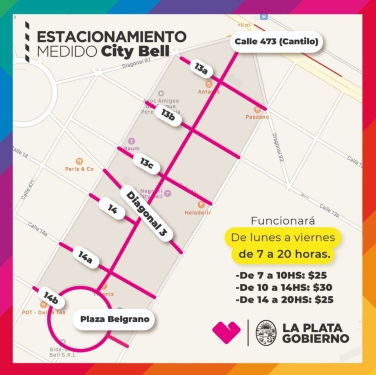 Este martes comenzó a funcionar el estacionamiento medido en el centro de City Bell. En ese marco, en el Municipio se informó que el sistema que rige en el Casco Urbano empezará de 7 a 20 en la zona céntrica de esa localidad.