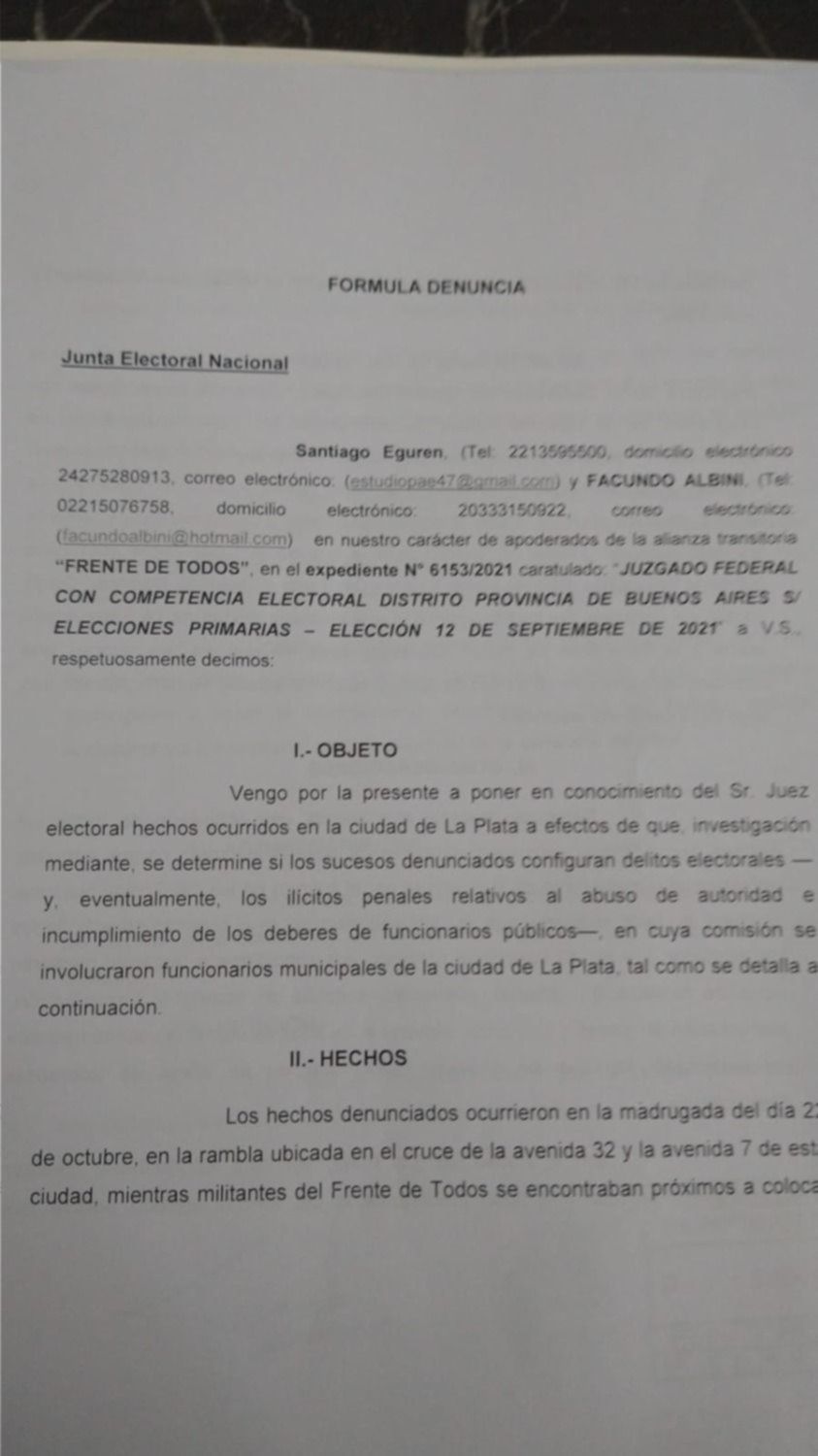 Los apoderados adjuntaron como prueba un video en donde se ve toda la secuencia. "Procedieron a decomisar exclusivamente los pasacalles del FdT, pese a que en el lugar había abundante cartelería del partido político Juntos de su candidato a diputado nacional, Diego Santilli. La cartelería del partido político que gobierna la ciudad de La Plata quedó intacta y la del Frente de Todos fue decomisada sin que medien razones que justifiquen ese proceder", argumentaron y aseguraron que "estas situaciones se han reiterado a lo largo de la campaña electoral".