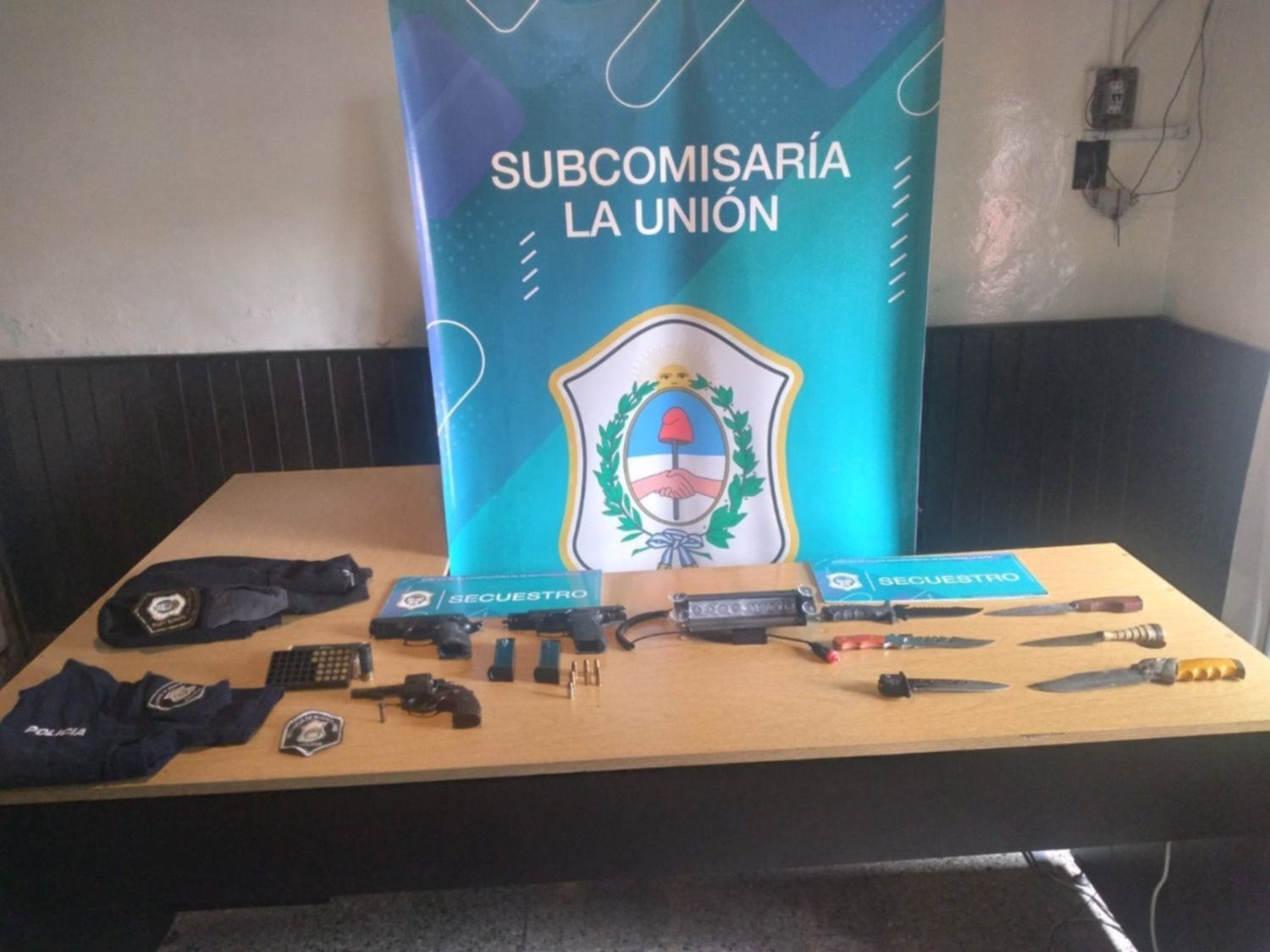 En las viviendas registradas, las autoridades incautaron dos armas de fuego (un revólver calibre 32 y una pistola doble acción marca Bersa), una réplica de pistola calibre 4.5, cartuchos y municiones, dos cuchillos de 16 y 18 cm de largo, una chomba y una tricota color azul con inscripciones de la Policía, un escudo bordado plateado de la Policía de la provincia de Buenos Aires y una baliza de similar a la policial.