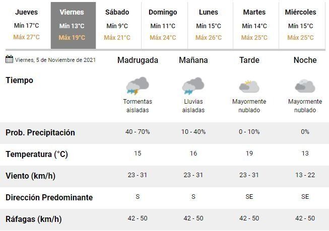 Las buenas nuevas se harán esperar al menos hasta el fin de semana. Para este viernes, mientras tanto, se aguarda uno de los peores días de la semana, con una temperatura de 13 a 19°C, fuertes precipitaciones durante las primeras horas de la mañana, intensos vientos con ráfagas de hasta 50 kilómetros por hora durante toda la jornada y, por supuesto, mucha humead.