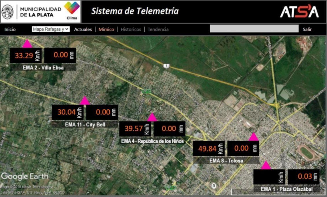 De acuerdo con el registro oficial, la velocidad más alta hasta el momento fue captada en la localidad de Tolosa, donde se registraron ráfagas de hasta 49,38 km/h. En la República de los Niños los vientos marcaron hasta 39,57 km/h y en Melchor Romero, San Carlos, Altos de San Lorenzo y Los Hornos superaron los 38 km/h.