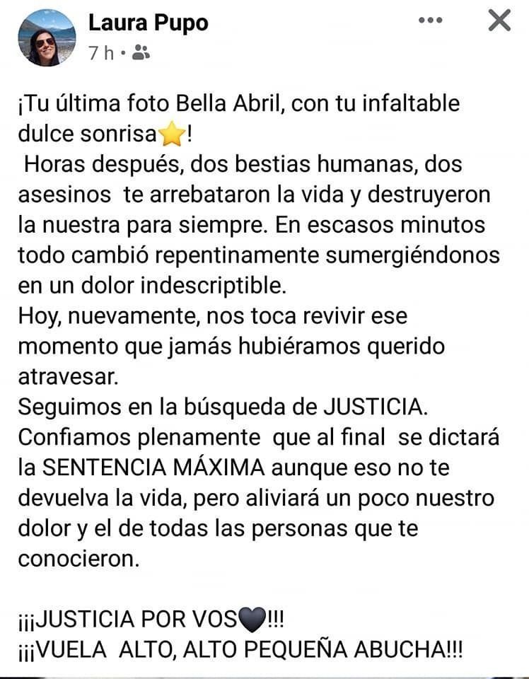 "Vuela alto, alto pequeña Abucha", cerró con gran dolor el posteo fue compartido en el grupo de Facebook "Justicia Por Abril Bogado" y en pocos minutos recibió cientos de comentarios para darle fuerzas a la familia, mientras se desarrolla uno de los dos acusados por el crimen es juzgado.