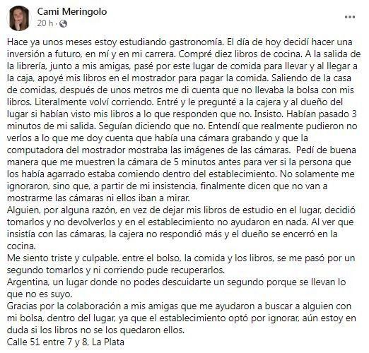 "Hace ya unos meses estoy estudiando gastronomía. El día de hoy decidí hacer una inversión a futuro, en mí y en mi carrera. Compré diez libros de cocina. A la salida de la librería, junto a mis amigas, pasé por este lugar de comida para llevar y al llegar a la caja, apoyé mis libros en el mostrador para pagar la comida", empieza el posteo de Facebook de Camila Merignolo en el que contó que tras salir del local se dio cuenta que se los había olvidado y al volver habían desaparecido como por arte de magia.