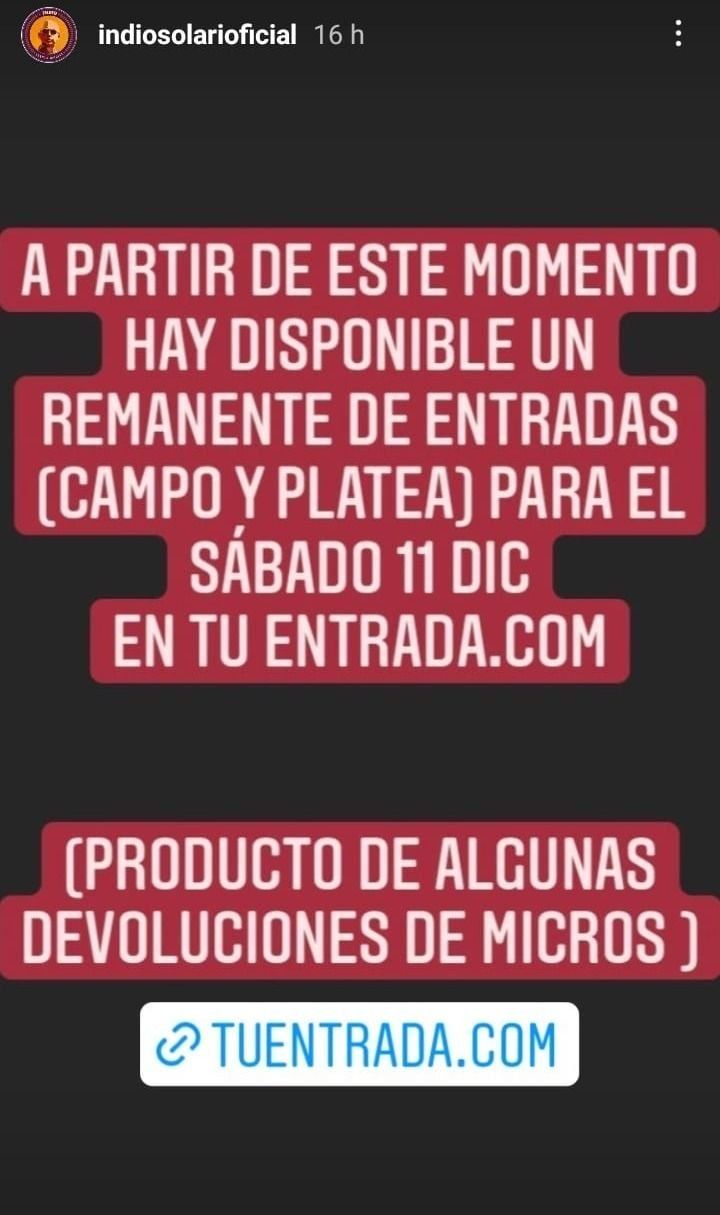En la antesala de los shows, desde su propia cuenta de Instagram, el Indio anunció que saldrán a la venta un remanente de localidades para la presentación de este sábado, algo que se viralizó de inmediato.