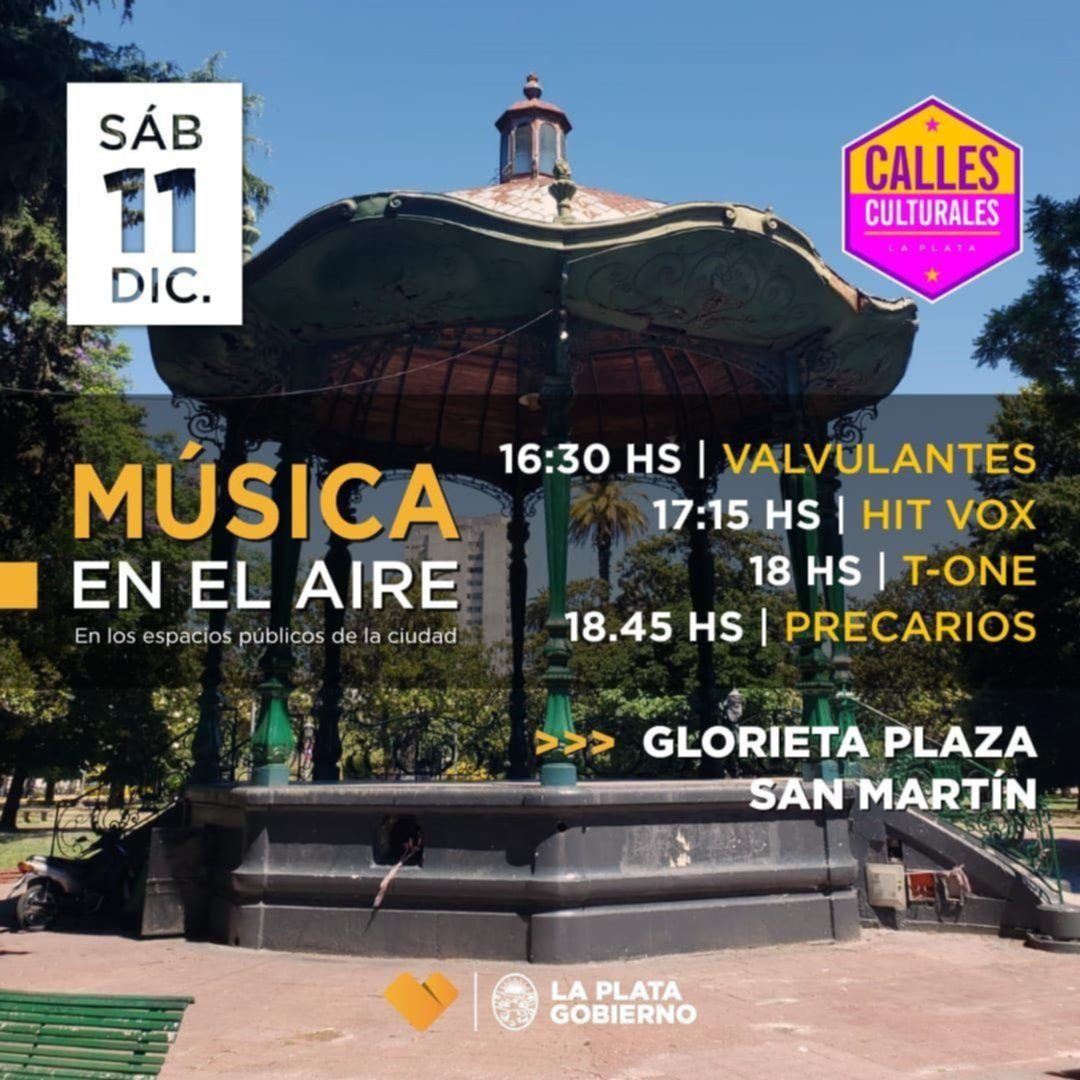 "Música en el Aire" se despide con una jornada cúlmine este sábado y desde las 16.30 horas en la histórica glorieta de la plaza San Martín, ubicada en 6 y 53; en el marco de una nueva jornada gratuita organizada por la Municipalidad y que contará con la presentación varios artistas platenses.