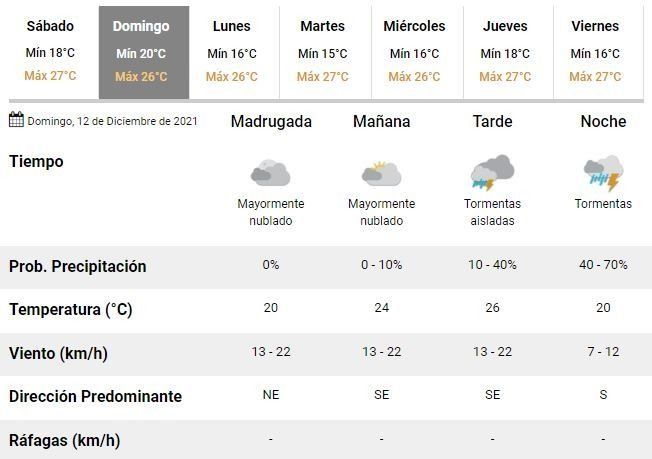 No obstante eso marcaron que a partir del lunes volverán las buenas condiciones del tiempo con poco cambio en la temperatura. El domingo estará con el cielo parcialmente nublado a nublado y con posibilidad de tormentas y una temperatura máxima que rondaría los 27 grados.