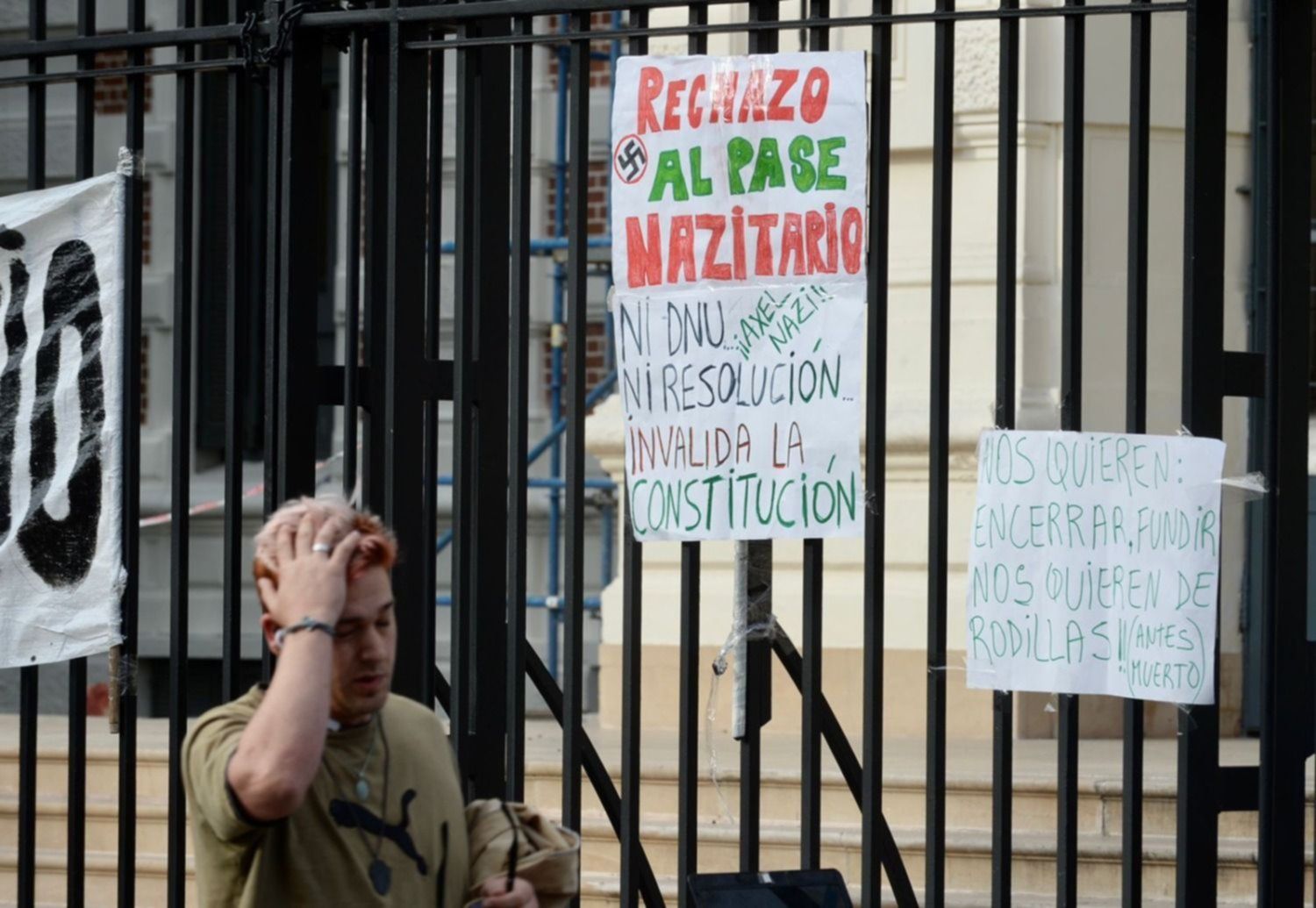 Las personas que marcharon frente al edificio gubernamental llevaron carteles y pancartas en las que se leían frases como: “Rechazo al pase Nazitario”, “Nos quieren encerrar, fundir, nos quieren de rodillas” y “fabricaron una pandemia”.