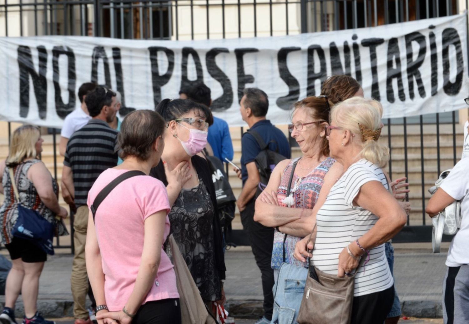 Un reducido grupo de vecinos de La Plata se agolpó en las puertas de la Casa de Gobierno, en 6 entre 51 y 53, para realizar una protesta antivacunas y una proclamación en rechazo a una de las últimas medidas del Gobierno para reducir el aumento de casos de COVID y retrasar la circulación de la variante Ómicron: el pase sanitario.
