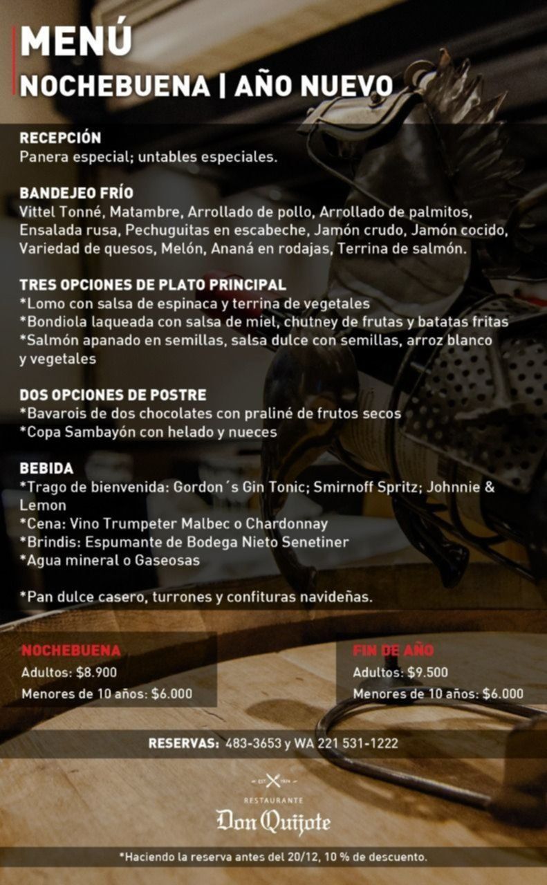 Con más de tres generaciones dedicadas a deleitar el paladar de los platenses, el histórico restaurante Don Quijote ofrece un menú de tres pasos, inspirado en los grandes clásicos de la cocina de fiestas. Con entrada, primer plato, postre y brindis con confituras navideñas, los comensales podrán disfrutar de una cena de Navidad o Año nuevo espectacular con la garantía del servicio que distingue a la marca.