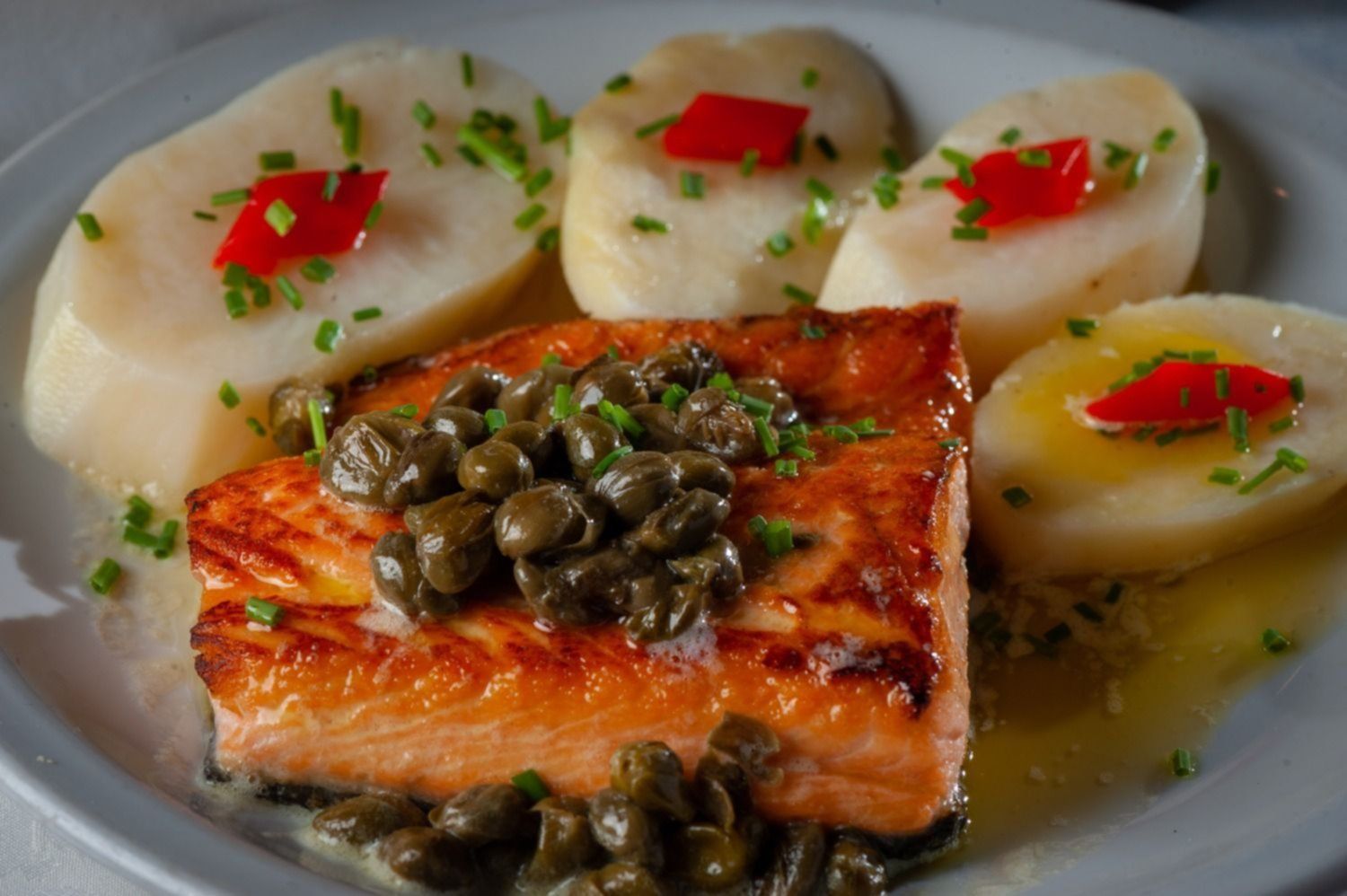 En lo que respecta al plato principal, se puede optar por un lomo con salsa de espinaca y terrina de vegetales, una bondiola laqueada con salsa de miel, chutney de frutas y batatas fritas; o una propuesta de salmón apanado en semillas, salsa dulce con semillas, arroz blanco y vegetales, para satisfacer toda la amplitud de paladares.