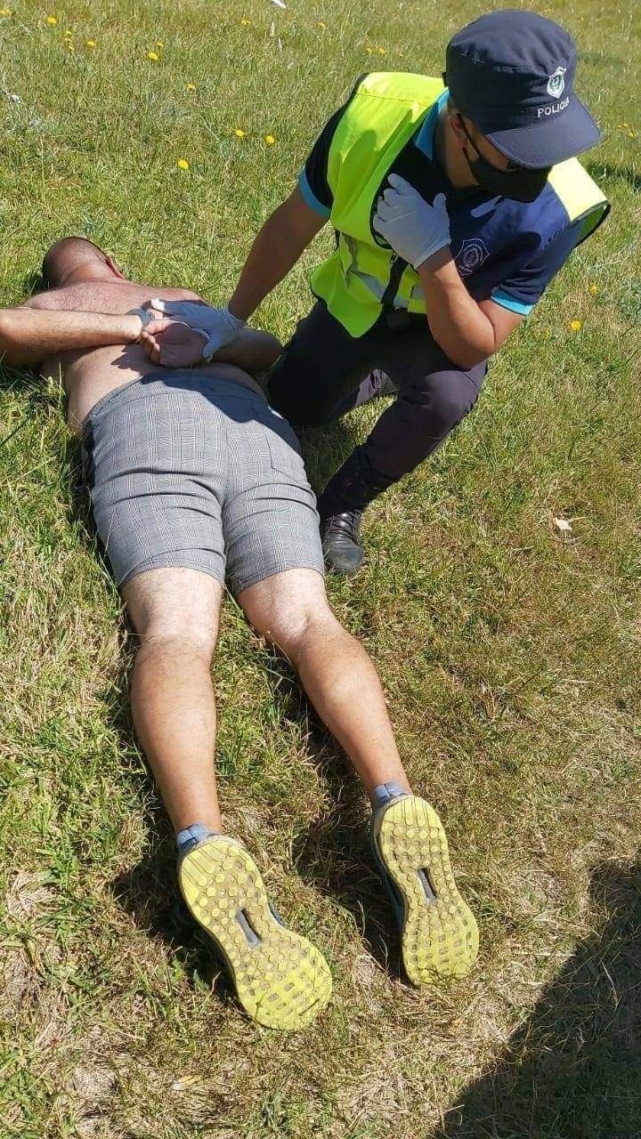 La situación tomó por sorpresa tanto al trabajador como a los testigos que en ese momento pasaban por el lugar, quienes no podían creer lo que estaban viendo. Inmediatamente, efectivos policiales intervinieron para tratar de calmar al implicado, pero este comenzó a insultar e, inclusive, se tomó los genitales frente a los agentes.