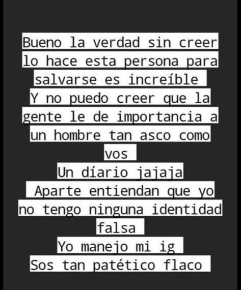 Tras la viralización del hecho en las redes y algunos medios locales, la mujer hizo un descargo: “Bueno la verdad sin creer lo que hace esta persona para salvarse, es increíble. Y no puedo creer que le dé importancia a un hombre tan asco como vos. Aparte entiendan que yo no tengo ninguna identidad falsa. Yo manejó mi IG (Instagram)… Sos tan patético, flaco”.