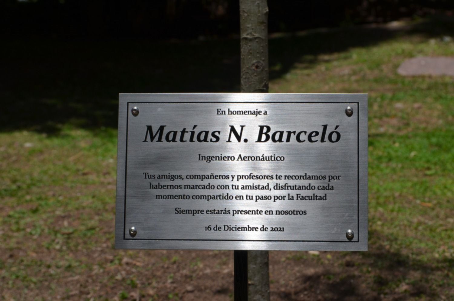 En la placa puede leerse: “En homenaje a Matías N. Barceló, Ingeniero Aeronáutico. Tus amigos, compañeros y profesores te recordamos por habernos marcado con tu amistad, disfrutando cada momento compartido en tu paso por la Facultad. Siempre estarás entre nosotros”.