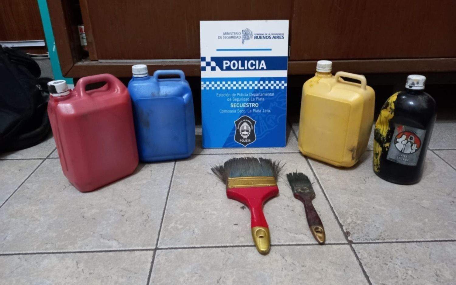 Personal policial de la comisaría Primera de La Plata, en el marco de sus tareas de prevención del delito, se acercaron al lugar y atraparon a los vándalos, a quienes les secuestraron tarros de pinturas y pinceles.