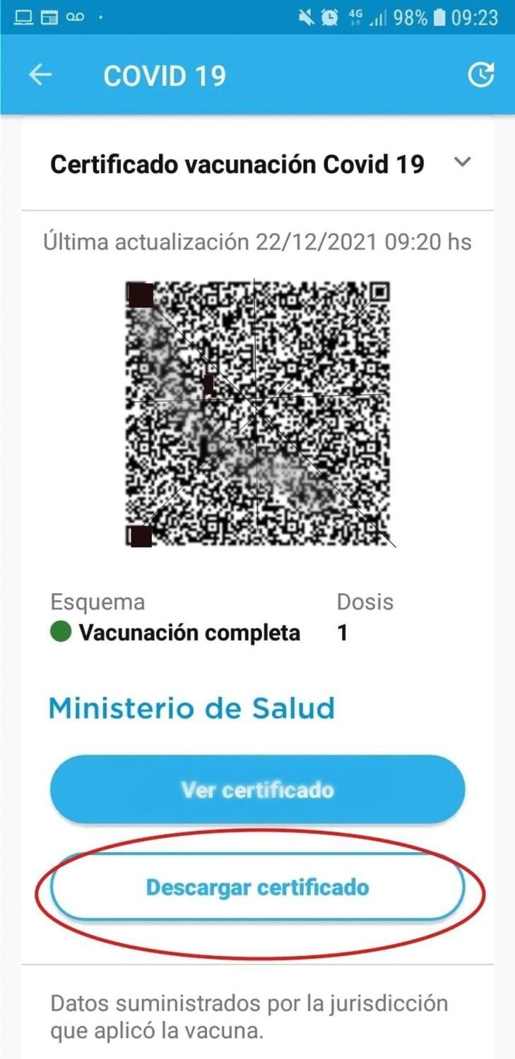 Cuando aparezca la pestaña del certificado, habrá que hacer click en él y en la pestaña aparecerá entonces el código QR que es leído por las autoridades sanitarias en los ingresos. Debajo estarán las opciones "ver certificado" y "descargar certificado", por lo que presionando esta última se podrá bajar para usar sin conexión.