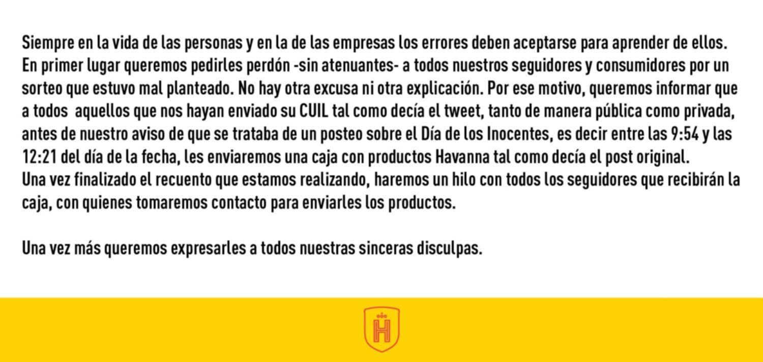 Finalmente la empresa emitió un comunicado a través del cual no solo admite el error sino que también anuncia que compensará al universo de seguidores que enviaron los datos para acceder a la preciada caja de alfajores. "Todos aquellos que nos hayan enviado su CUIL (...) antes de nuestro aviso de que se trataba de un posteo sobre el Día de los Inocentes, es decir en entre las 9:54 y las 12:21 del día de la fecha, les enviaremos una caja de productos Havanna tal como decía el posteo original", dice.