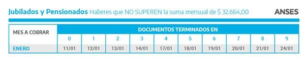 En el caso de las jubilaciones y pensiones que no superen los $32.664, se pagarán en las siguientes fechas de acuerdo con el último dígito del documento: 11/1 (0), 12/1 (1), 13/1 (2), 14/1 (3), 17/1 (4), 18/1 (5), 19/1 (6), 20/1 (7), 21/1 (8) y 24/1 (9).