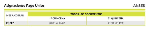 Las Asignaciones Pago Único se pagarán en dos quincenas: la primera entre el 7 y el 14 de febrero y la segunda entre el 21 de enero y el 14 de febrero.
