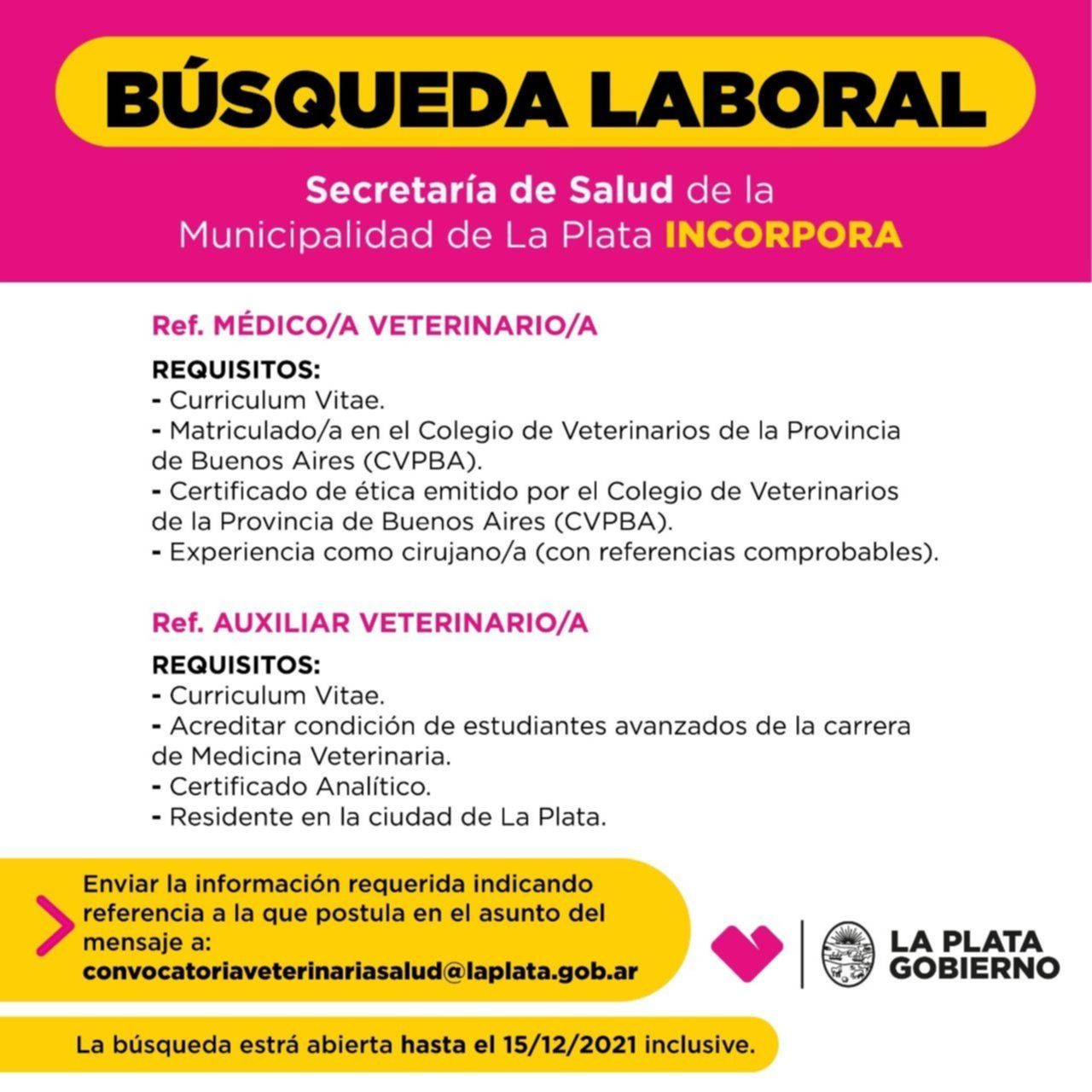 La Municipalidad de La Plata abrió una búsqueda laboral para profesionales veterinarios, con el objetivo de cubrir puestos en el marco de las campañas de castraciones gratuitas destinadas a perros y gatos en la ciudad.