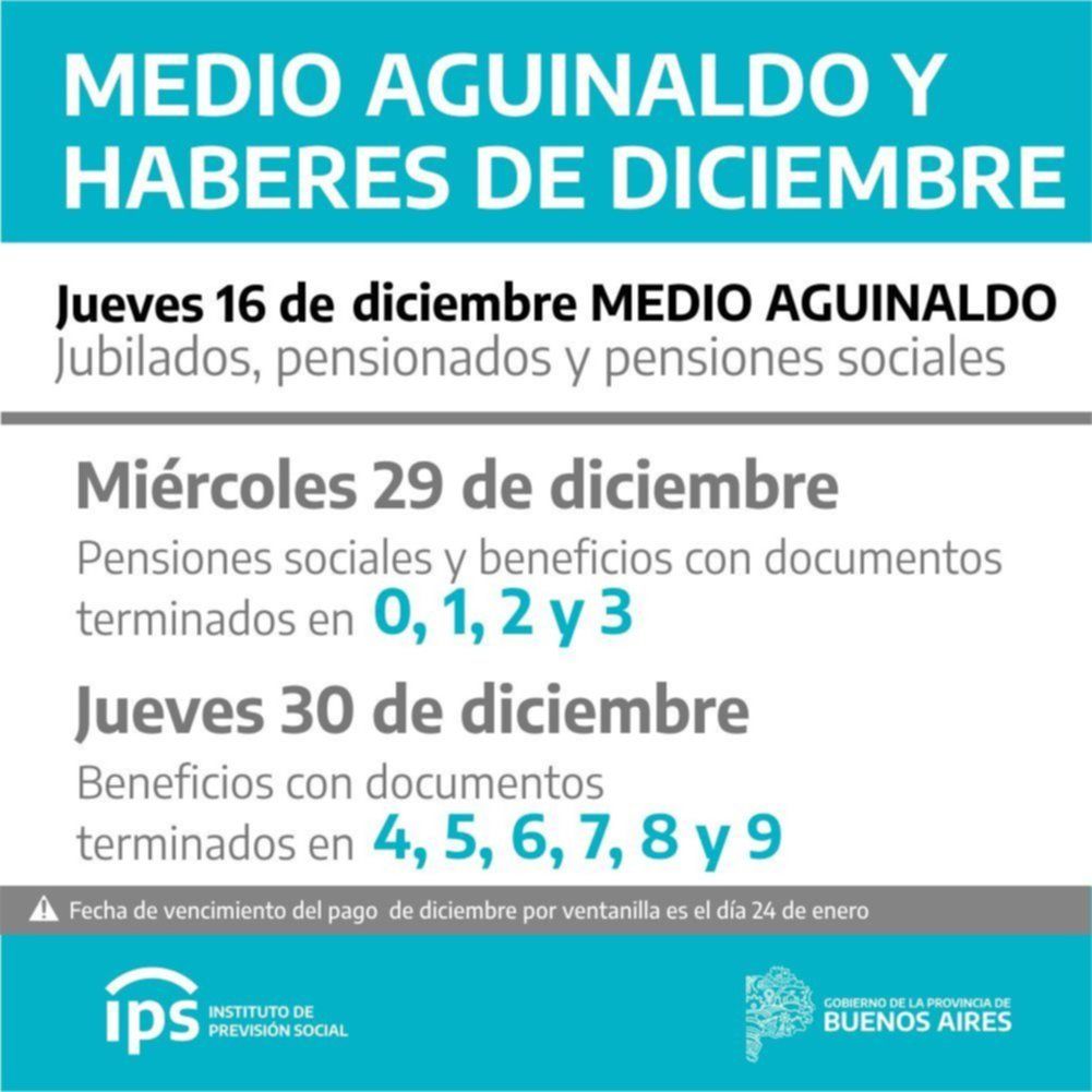 Los jubilados y pensionados bonaerenses cobrarán el medio aguinaldo el próximo jueves 16 de diciembre, según informaron las autoridades del Instituto de Previsión Social (IPS). El organismo especificó que, a partir de esa fecha, el SAC estará disponible en las cuentas de todos ellos automáticamente.