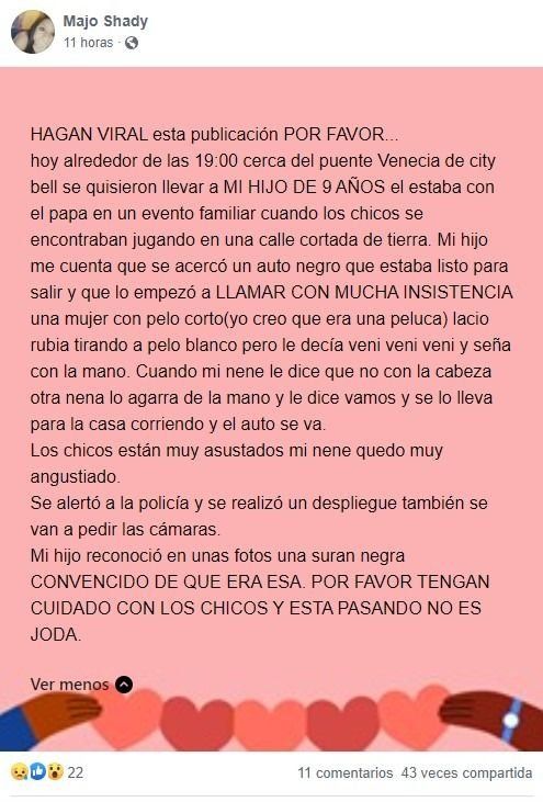 "Hoy (lunes) alrededor de las 19, cerca del puente Venecia de City Bell, se quisieron llevar a mi hijo de 9 años", relató Majo desde su cuenta de Facebook y continuó: "Estaba con el papá en un evento familiar cuando los chicos se encontraban jugando en una calle cortada, de tierra. Mi hijo me cuenta que se acercó un auto negro que estaba listo para salir y que lo empezó a llamar con mucha insistencia una mujer con pelo corto (yo creo que era una peluca), lacio, rubia tirando a pelo blanco. Le decía 'vení, vení, vení', y le hizo seña con la mano. Cuando mi nene le dice que no con la cabeza, otra nena lo agarra de la mano y le dice vamos y se lo lleva para la casa corriendo y el auto se va".