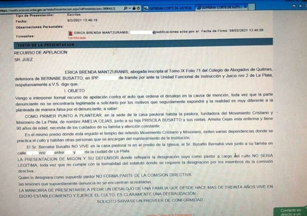 Para la abogada, la presentación en la que se reflejaría la designación del nuevo pastor a cargo del culto "no sería legítima" ya que "no cumple con la formalidad del estatuto", se detalla en otro pasaje de la apelación. "La maniobra de presentarse a pedir un desalojo de una familia que desde hace más de treinta años vive en dicho establecimiento y ejerce el culto, es claramente una defraudación", sostuvo Mantzuranis.