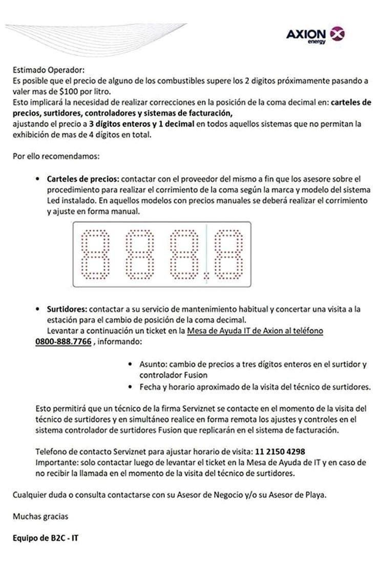 De acuerdo a la copia que se viralizó en las redes sociales, el valor de algunos combustibles podría superar los dos dígitos en las próximas horas, lo que “implicaría la necesidad de realizar correcciones de la coma decimal en: carteles de precios, surtidores, controladores y sistemas de facturación, ajustando el precio a 3 dígitos enteros y 1 decimal en todos aquellos sistemas que no permitan la exhibición de más de 4 dígitos totales".