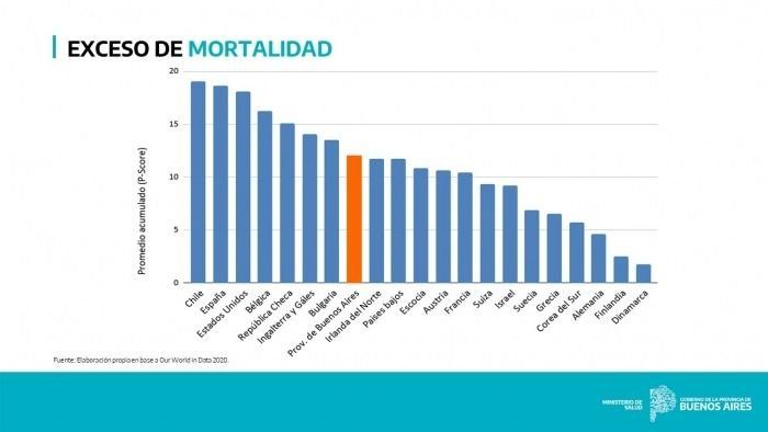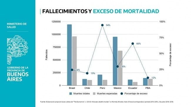 El ministerio de Salud de Buenos Aires informó que el “exceso de mortalidad” que generó el coronavirus en todo el territorio bonaerense fue del 12%, en comparación con los decesos anuales considerados “esperables”, en caso de que no hubiese existido la pandemia. De acuerdo con este indicador, que se utiliza en todo el mundo, en la Provincia se produjo un exceso menor a lugares como Chile, España o Estados Unidos y similar al de Escocia, Suiza, Países Bajos, Austria y Francia.