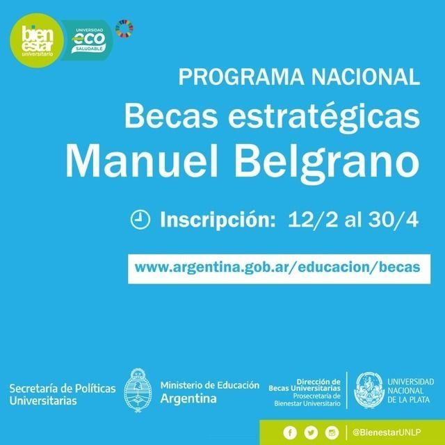 El ministerio de Educación de la Nación lanzó el Programa Nacional de Becas estratégicas Manuel Belgrano, con el fin de promover el acceso, la permanencia y la finalización de estudios de grado y pregrado en ocho áreas de política pública consideradas claves para el desarrollo económico del país y la igualdad social: Petróleo, Gas, Minería, Computación e informática, Medio ambiente, Logística y transporte, Alimentos y Energía.