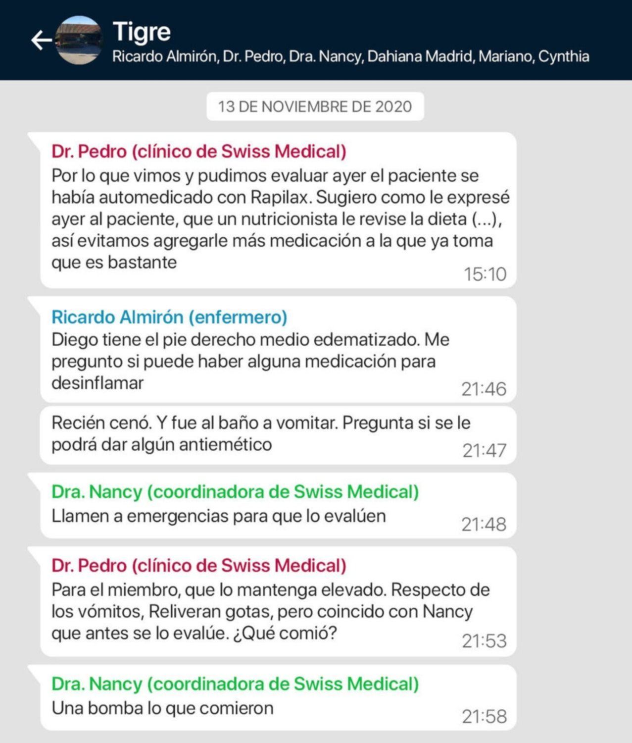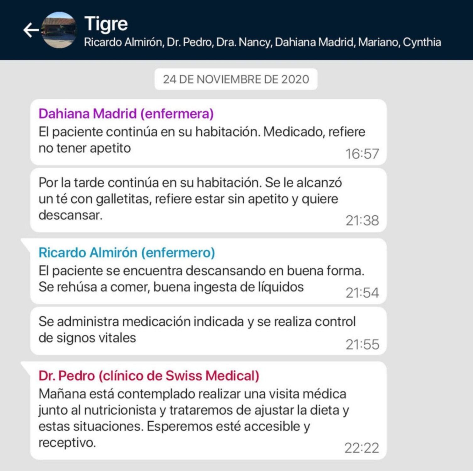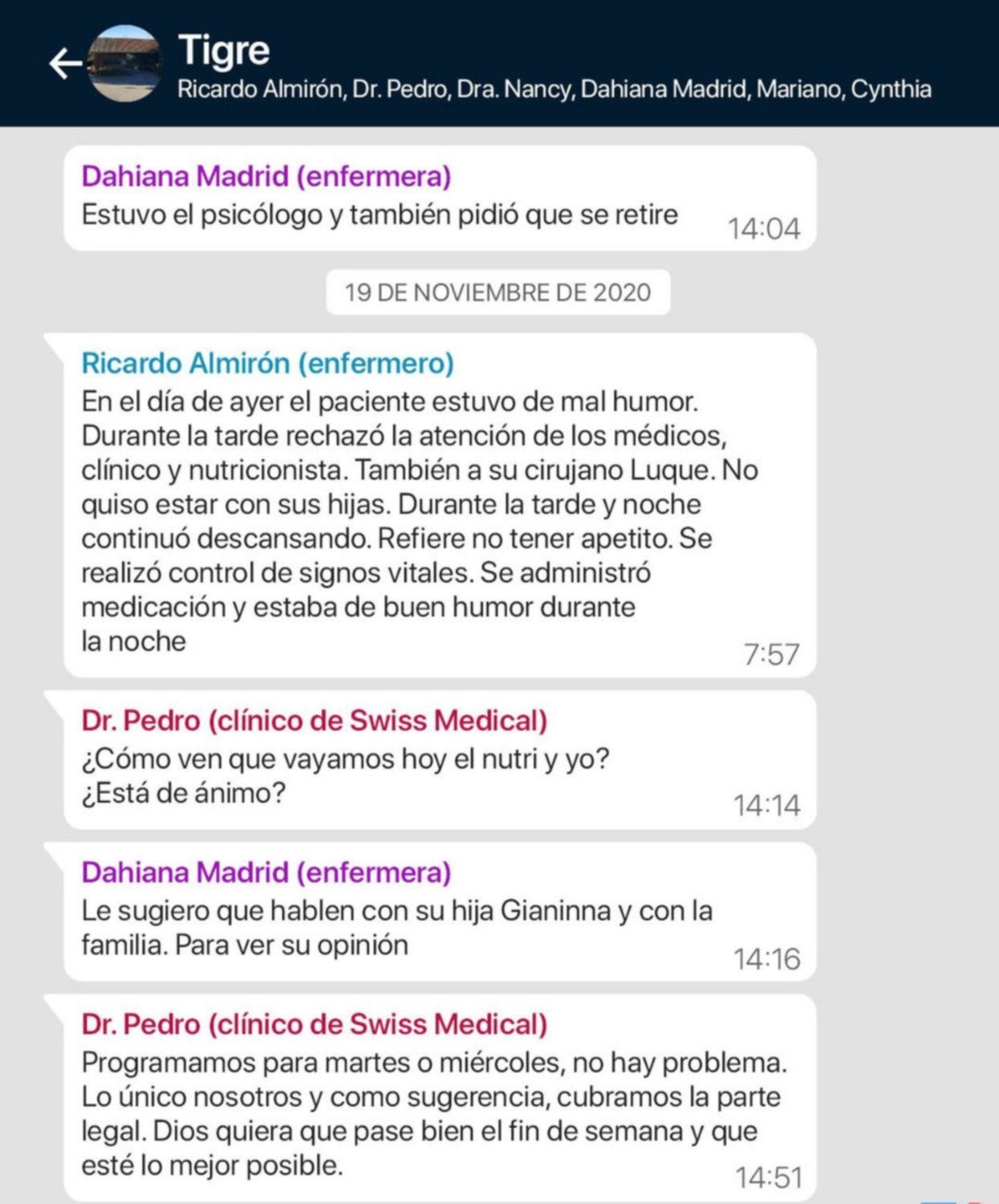 Vale destacar que el grupo en cuestión fue creado para que los enfermeros de la empresa "Medidom" que cuidaron a Maradona reportaran a sus superiores y a los médicos coordinadores de la prepaga Swiss Medical, el parte diario y cualquier eventualidad que surgiera.