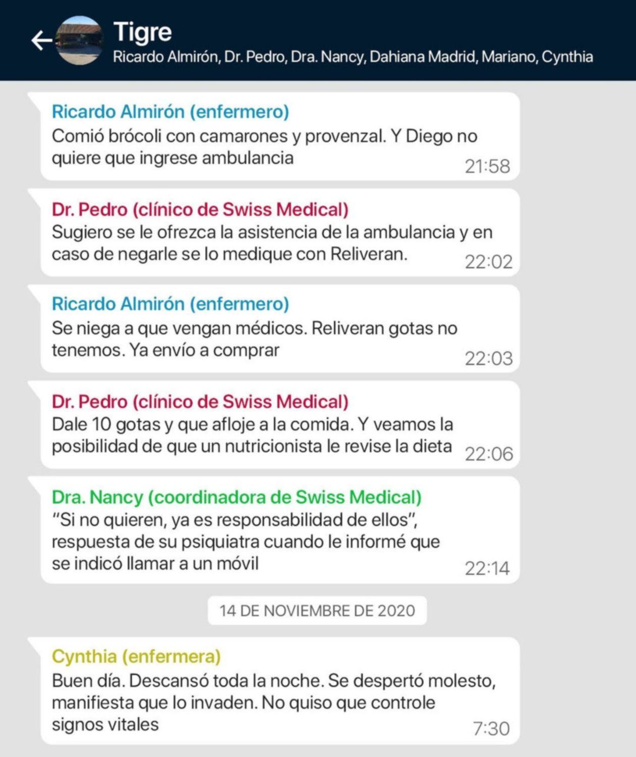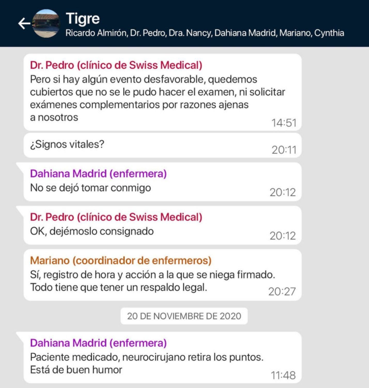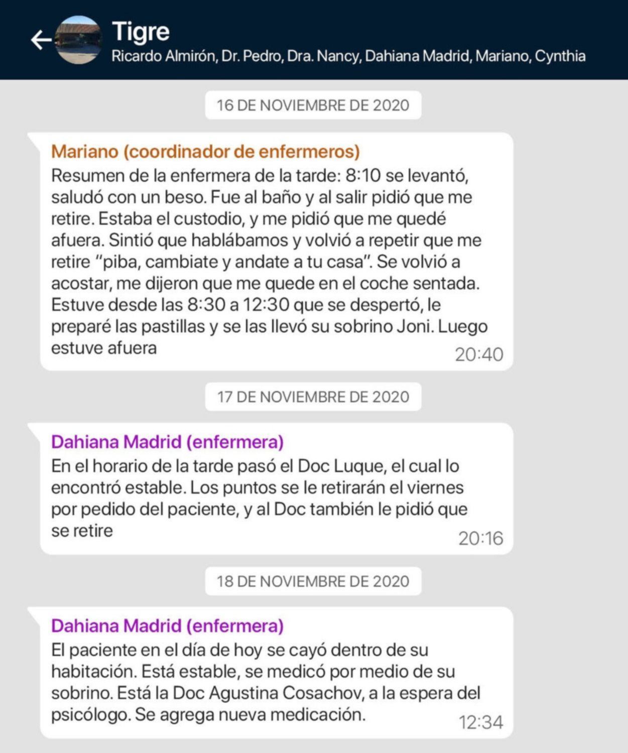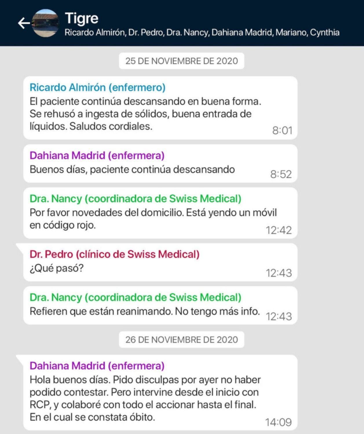 Vale destacar que el grupo en cuestión fue creado para que los enfermeros de la empresa "Medidom" que cuidaron a Maradona reportaran a sus superiores y a los médicos coordinadores de la prepaga Swiss Medical, el parte diario y cualquier eventualidad que surgiera.