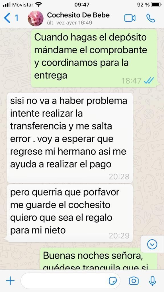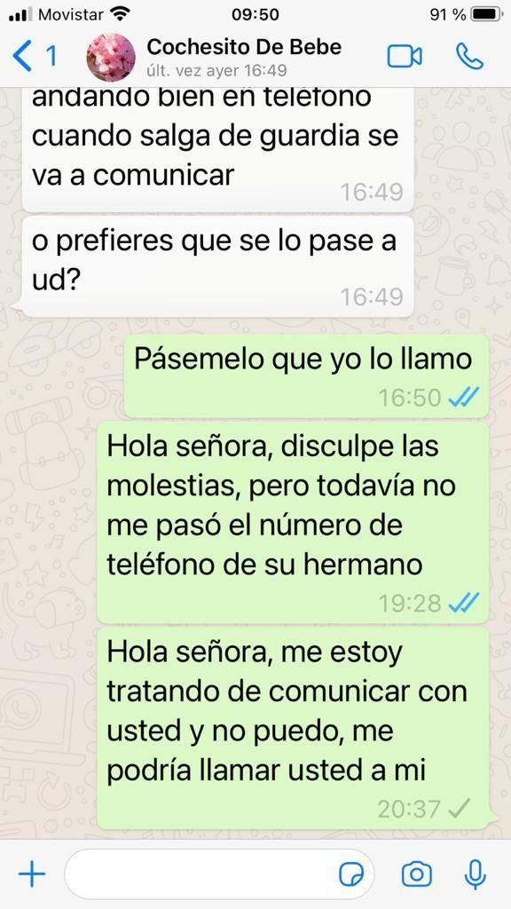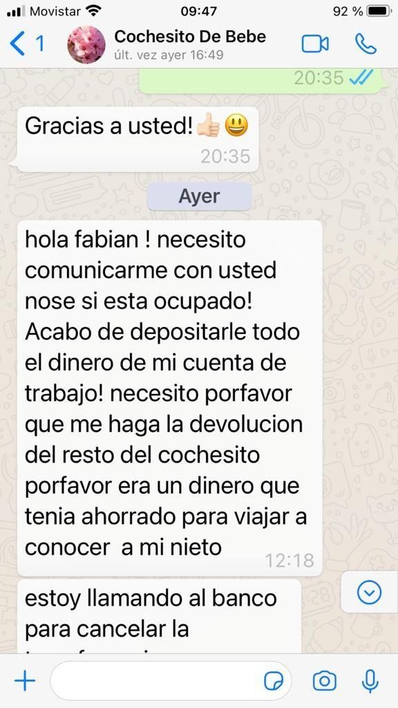 De inmediato, intentó contactarse con ellos por teléfono pero no obtuvo respuesta. En ese mismo momento, le llegó un mensaje de la mujer que le había escrito por el cochecito, la cual le contó que se había equivocado y que, en lugar de abonar el producto, le había enviado todos sus ahorros.