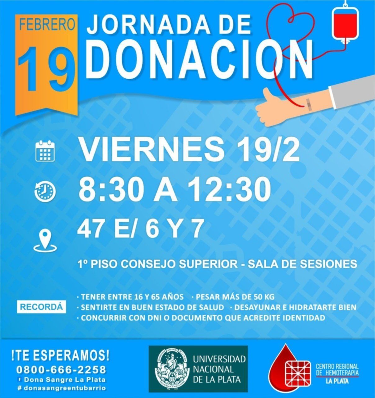 Este viernes se llevará a adelante una nueva Jornada de Donación de Sangre organizada por la Universidad Nacional de La Plata (UNLP) y el Centro Regional de Hemoterapia.