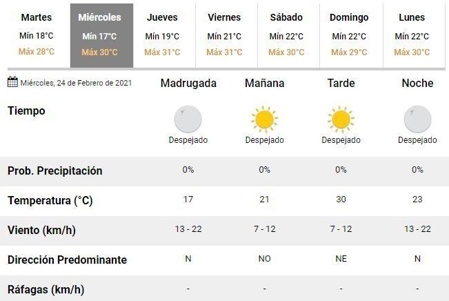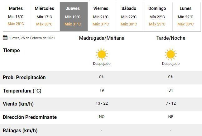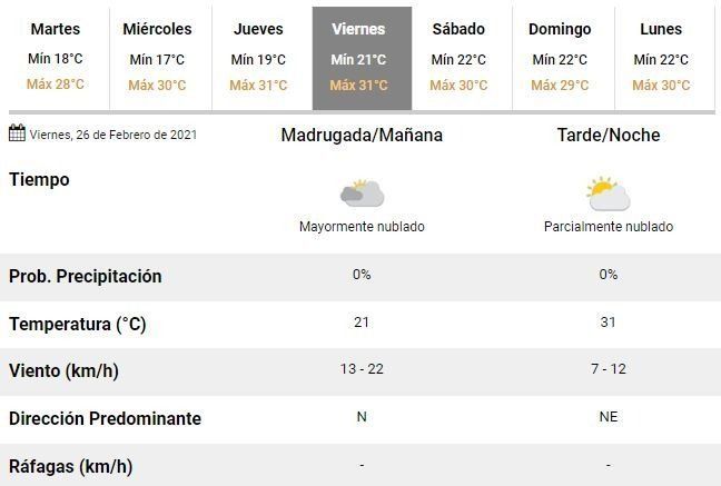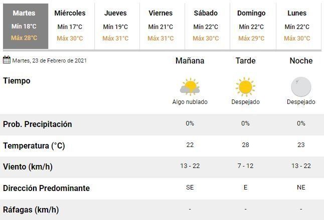 Para este martes se esperan 26°C de máxima y en los días venideros hará aún más calor alcanzando el viernes los 31°C durante la tarde, siempre con sol.