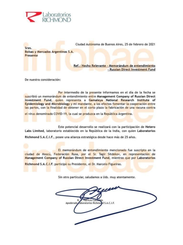 La empresa confirmó que el proyecto contempla la construcción inmediata de una planta especializada y de alta tecnología en la zona de Pilar -donde actualmente está emplazada la planta de Richmond- en el país para la producción de vacunas en general y contra el COVID-19 en particular, comenzando por la Sputnik V. La construcción de la planta contemplará los procesos de formulación y rellenado.
