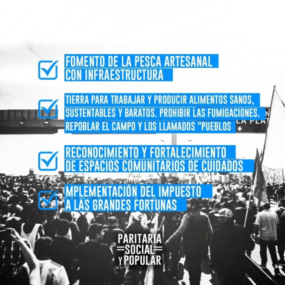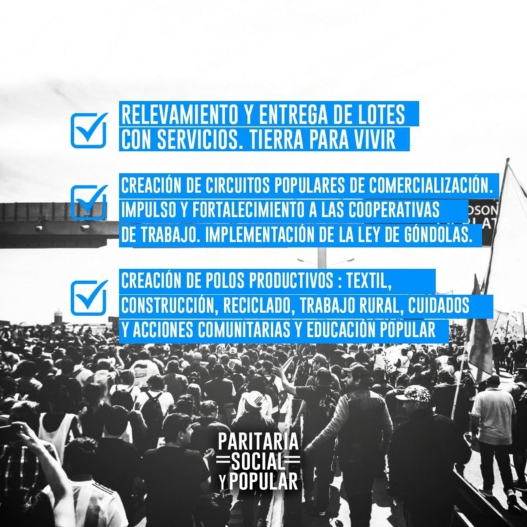 También pedirán un "relevamiento y entrega de lotes con servicios, tierras para la construcción de viviendas y para la producción de alimentos, la creación de circuitos populares de comercialización; impulso y fortalecimiento a las cooperativas de trabajo; la implementación de la Ley de Góndolas y la creación de polos productivos en todas las ramas y tareas de cuidado: textil, construcción, reciclado, trabajo rural, cuidados y acciones comunitarias, educación popular, infraestructura".