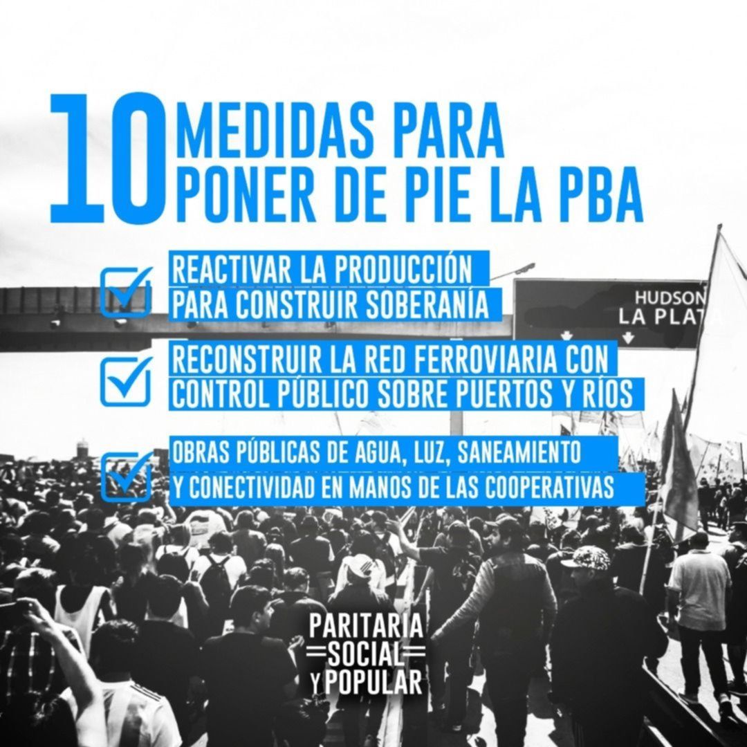 Luego, detalló parte de las propuestas que le entregarán a Kicillof: "La reactivación de la producción para construir soberanía, reconstruir la red ferroviaria con control público sobre puertos y ríos. Soberanía es recuperar sectores estratégicos para el bien común y la realización de obras públicas de agua, luz, saneamiento y conectividad en manos de las cooperativas como parte del plan de urbanización de los barrios populares".