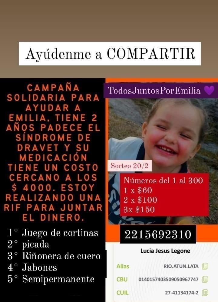 En esa línea, agregó además que "le recetaron DIAZEPAM INTRARECTAL 5MG , en el hospital de niños no hay para entregarle y la medicación tiene un valor de $3.910 x 5 dosis , dinero con el que no cuento" y destacó: "Pido ayuda a los platenses muchos ayudaron con dinero otros ayudaron para que pueda realizar un sorteó ya que esta medicación la usara por largo tiempo y cada 5 dosis debo pagar $3.910 pesos. Con la ayuda de la gente pude comprar las primeras dosis. Las cuales utilice la semana pasada con una recaída que tuvo Emilia por eso vuelvo a hacer otra rifa. TODOSJUNTOSPOREMILIA”.