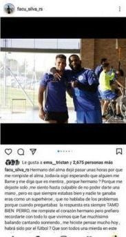En una extensa reflexión y casi haciendo un mea culpa, Facundo Silva escribió: "Me hiciste pensar hoy, ¿habrá sido por el fútbol? Son todos una mierda en este ambiente, nadie valora nada y lo que menos les importa es la persona. ¿Por qué hiciste eso, hermano? Estoy completamente roto, vacío por completo. Sé que no vas a estar más, pero cómo te voy a extrañar",