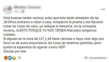 "Nos entraron a robar a casa, rompieron la puerta y se llevaron todas las cosas de valor. Ya radiqué la denuncia en la comisaría Novena. Alerto porque ya nos tienen marcados, tengamos cuidado", aseguró la propietaria a través de una publicación en las redes sociales.