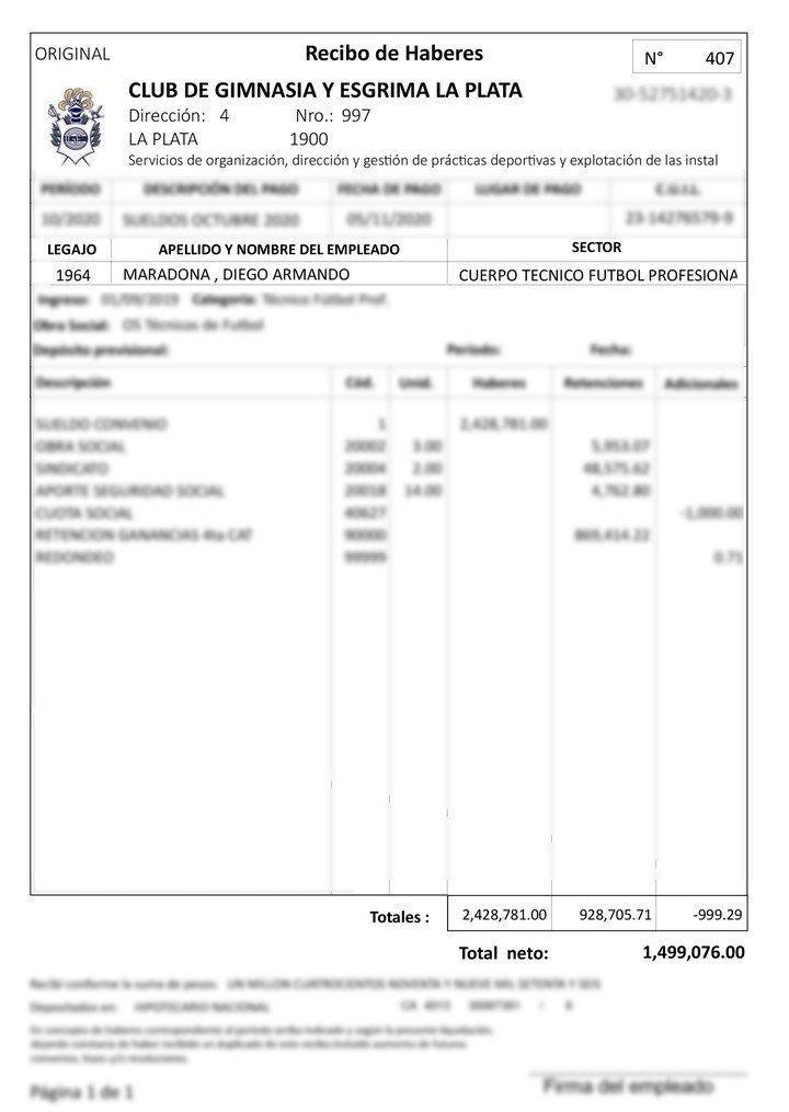 Gimnasia presentó el sueldo de Diego Maradona, pero crecen las sospechas de que podría no ser real. El Lobo presentó ante la Justicia los comprobantes de salario del ex DT y quienes acusan al entorno del Diez por su estado de salud y el abandono en el que falleció, pedirán que se investiguen las cifras para comprobar la veracidad del documento.
