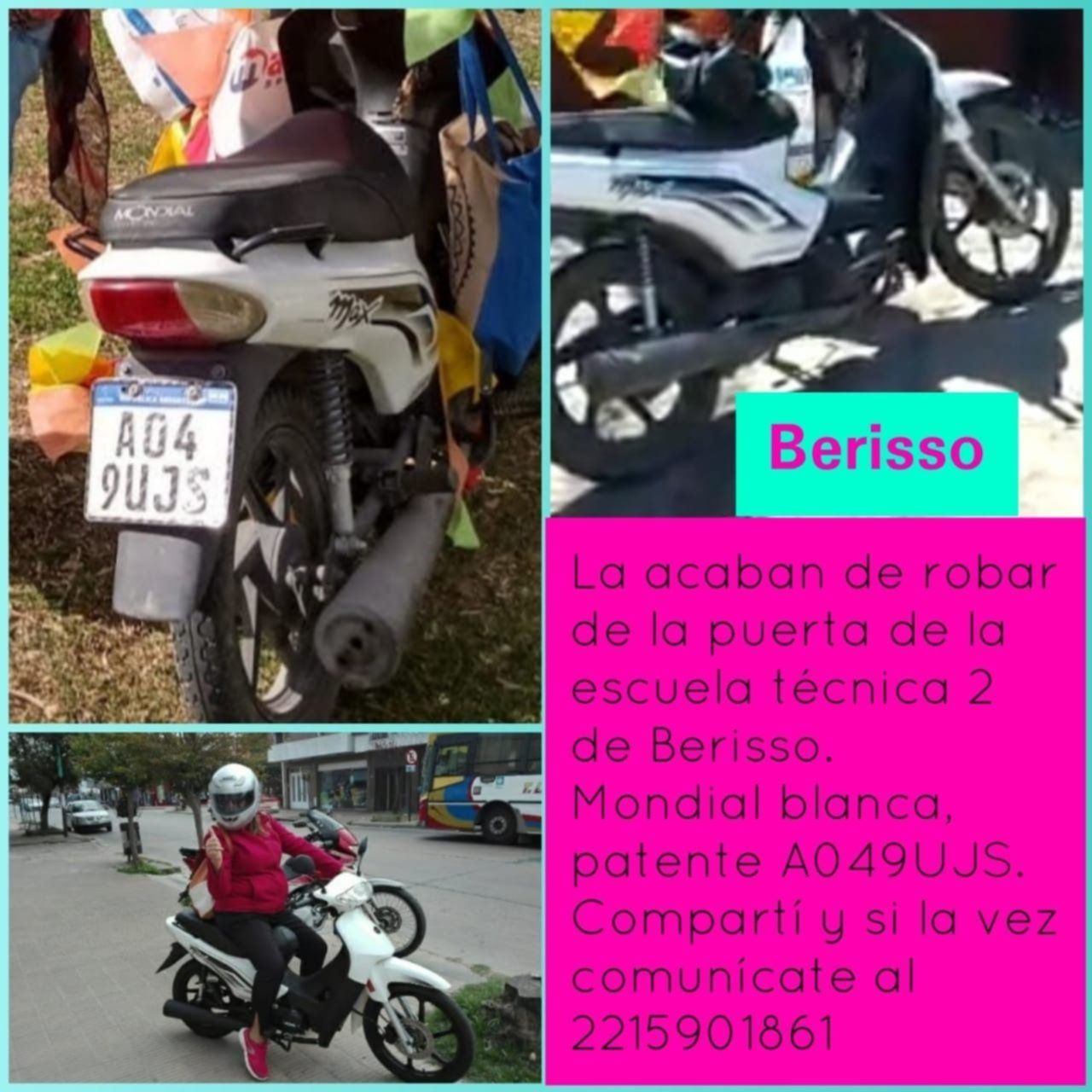 Por este motivo, cualquier persona que tenga información sobre la moto Mondial, color blanco y patente A049UJS, puede comunicarse al (221) 15-5901861.