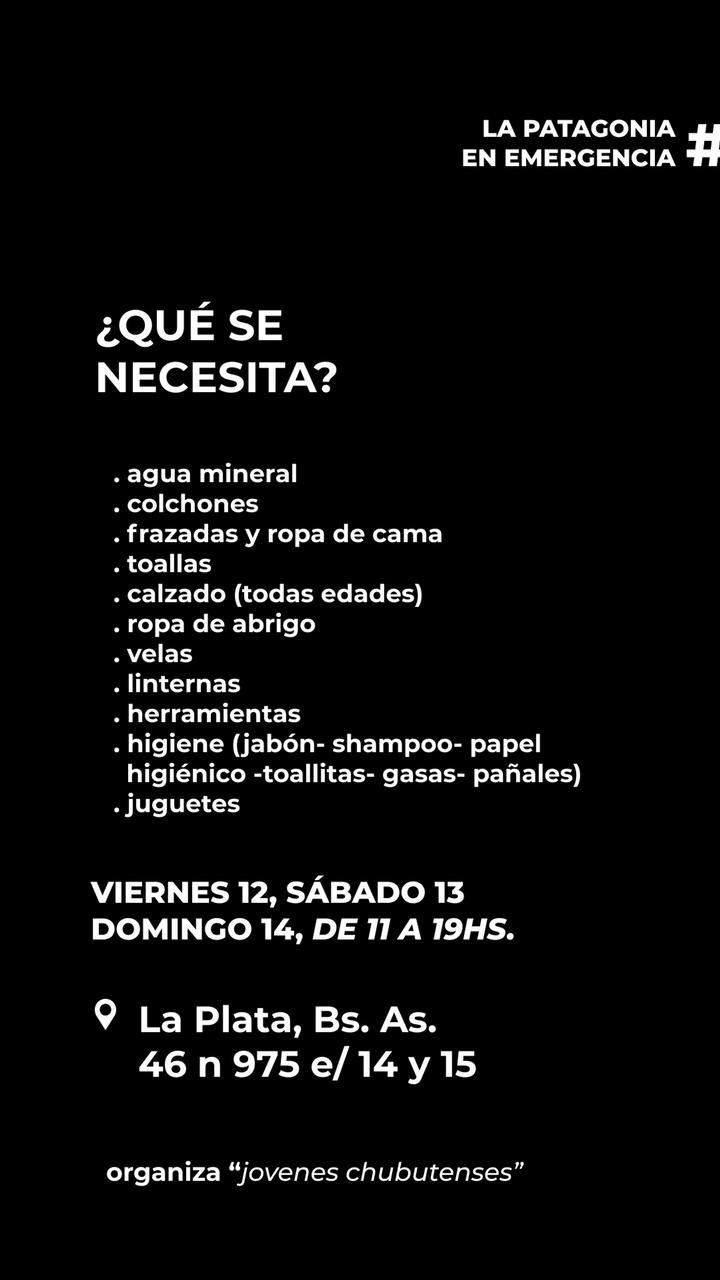 Esta campaña solidaria está organizada también por representantes del Centro Universitario de Chubut (CUCH) junto a un grupo de jóvenes profesionales de Lago Puelo que reside en La Plata. Este viernes, sábado y domingo se estarán recibiendo donaciones para enviar a las localidades afectadas, en la sede ubicada en calle 46 Nº 975 entre 14 y 15, en el horario de 11 a 19.