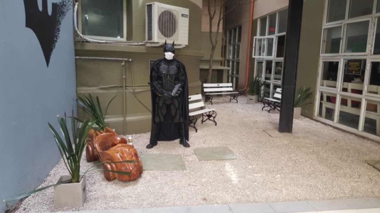 El superhéroe agradeció a Leticia Sánchez Laugle, la artista que donó la escultura en madera de un batimóvil para que los chicos internados puedan jugar con él en el patio que, hasta hace pocos días, se veía gris y monótono.